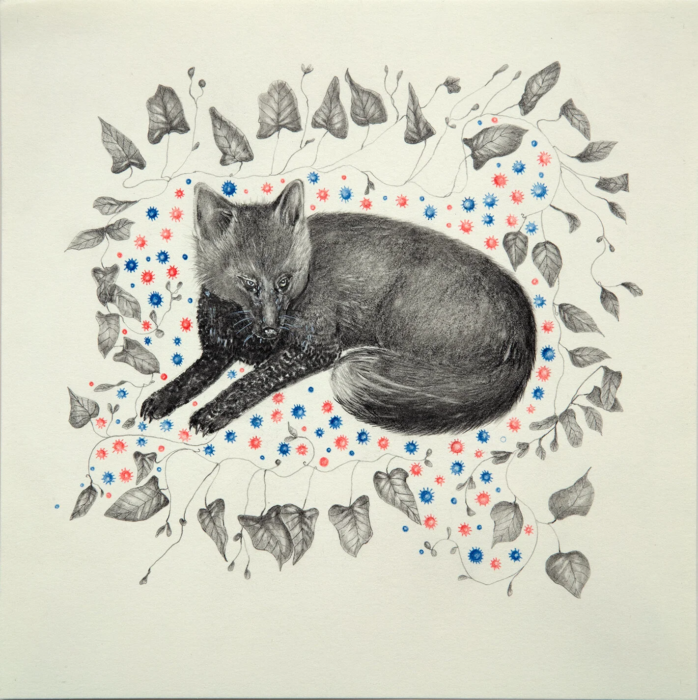 I set a really limited parameter of just using only pencil and graphite, learning to use all shades and grades. As the news of the origns of the virus spillover unfolded I happened to see a documentary on Asian wet markets and so chose the animals found in them as my starting point. I was also thinking about Illuminated Manuscripts and how historically they were documents of knowledge and literacy in a time when many were unable to access them but they maintained a lineage of knowledge to be passed down. It occured to me that we have largely lost our sense of “literacy” or ability to read the natural world so I wanted to create a record of this moment that we are in with in this framework. The animals are all nestled in their habitats, the foliage that surrounds them protects and contains both them and the virus particles. Our intrusion and destruction of habitat has brought us into contact with pathogens we would normally be buffered from thanks to biodiversity. The wet markets, by placing species together that would normally never meet in the wild has amplified and accelerated the spillover that has now brought the world to a standstill. A microscopic, invisible peice of genetic material has halted and humbled our species. A virus is just genetic code looking for a habitat and sadly for us it looks as though it may be here to stay.